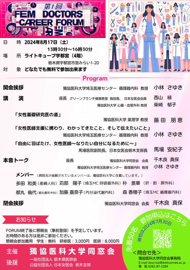 お知らせ続きですが、8月17日は同窓会主催 日本女医会栃木支部ならびに栃木県医師会後援の第1回 FEM DOCTORS CAREER FORUM が開催されます。現在、どこの医学部も女子学生が増加し半数近くとなっています。しかしながら、将来予想される出産、育児その他の自分自身のライフプランと仕事の両立等について話し合う場所が少ないように思いました。そこで本院の心臓血管外科教授である柴崎郁子先生(17期)を中心として、初の会合を開催するに至りました。講演ありディスカッションありの盛り沢山の会となりそうです。次回の会⻑コラムでその様子をご報告させて頂きたいと思います。